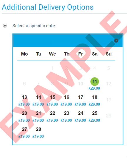 The Select a Specific Date calendar will give all the available delivery dates including a next day option (Shown here in green). Depending on your exact location and the type of product, the charge for next day delivery will be shown underneath the date option.