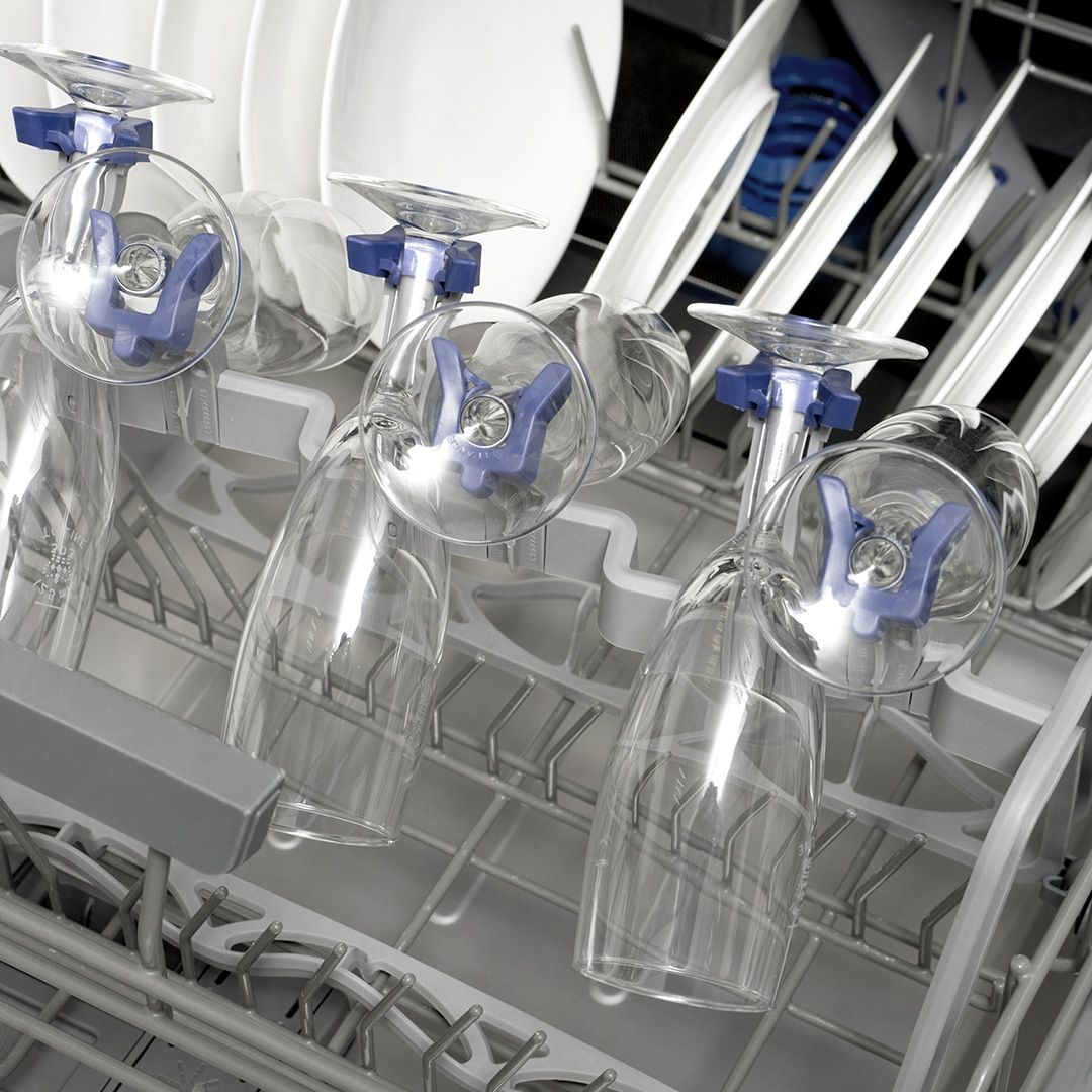 - Upper and lower wine glass racks racks [with rubber grips] built into the baskets