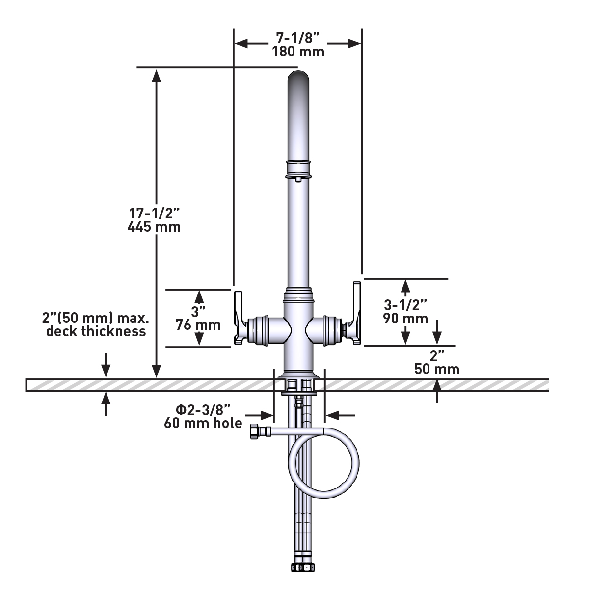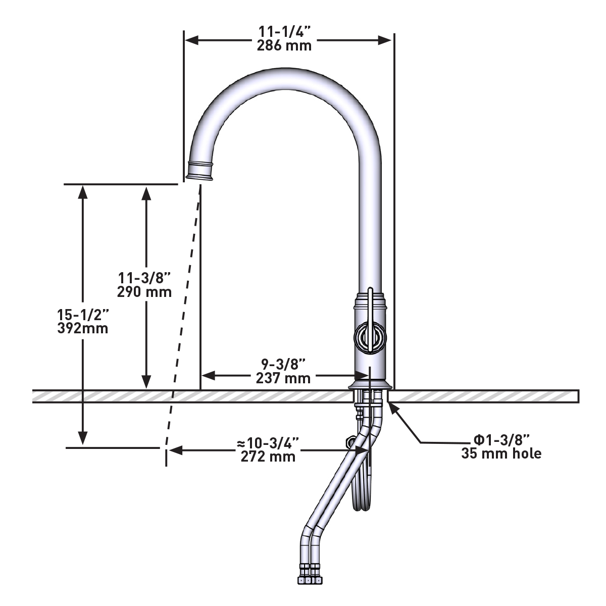 All Perrin and Rowe kitchen taps are supplied with full fixing kits which include the supply tails.  As they are manufactured in the UK, each Perrin and Rowe kitchen tap will connect to standard 15mm supplies.  The hole size is a standard 35mm and is therefore suitable for almost all Kitchen sinks and worktops.